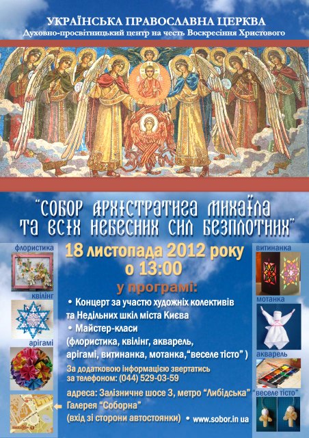 12 November 201218 листопада з благословення Блаженнійшого Володимира, Предстоятеля Української Православної Церкви, Духовно-просвітницький центр на честь Воскресіння Христового запрошує Недільні школи міста Києва на святкування Собору Архістратига Михаїла та всіх Небесних сил безплотних, яке відбудеться на галереї «Соборна» о 13:00.