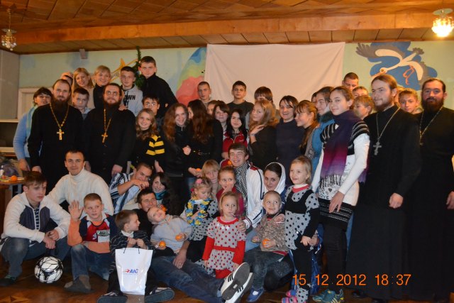 Директор «Сонечка» Галина Опанасівна Хижняк зустріла гостей, на чолі з керівником нашої молодіжки о. Андрієм, дуже приязно, провела з ними невеличку екскурсію по будинку, а потім зібрала до них своїх вихованців. Дітей було близько 20, решту розібрали на вихідні дні по домівках родичі. Серед присутніх діточок віком від 3 до 6 років були як повносправні, так і з вадами розумового розвитку, і до кожного з них кияни мали свій підхід. В них дійсно було чому повчитися в плані спілкування з настільки різними дітьми. Гості, ніби справжні Діди Морози, мали з собою цілий мішок з подарунками та заготовками для спільної праці по виготовленню всіляких забавок — новорічних іграшок, мозаїчних картинок з природних матеріалів (круп, сушених кропу та петрушки, кольорової кондитерської посипки — всього, що діти можуть безпечно тягнути до рота), великих пінопластових пазлів тощо. На жаль, час роботи був дуже обмежений, всього 1 година (стільки дозволяв режим дня у будинку). Все, зроблене разом з дітьми, залишилось їм для користування, а також київські гості пригостили малечу мандаринами та іншими фруктами.