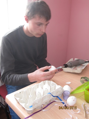 А в это время, другие старшеклассники делали пасхальные яйца с элементами резьбы по яичной скорлупе и дальнейшим их декорированием. Это очень кропотливая и аккуратная работа, требующая терпения. Немногие дети справились с этим делом, но у тех, кто приложил свои усилия, получились настоящие шедевры.
