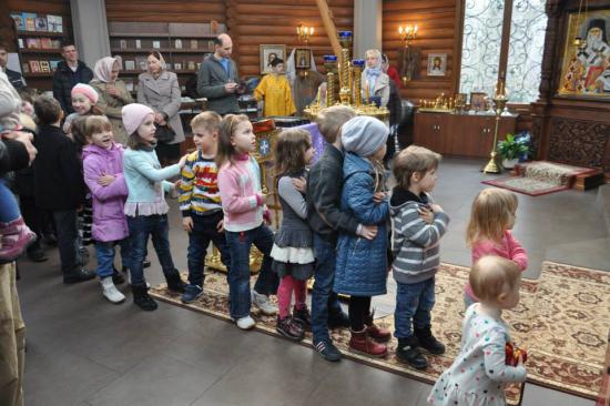 Также во время службы в отдельном помещении педагоги проводят занятия воскресной школы, детей приводят только для Причастия. В храме есть послушники, которые могут подсказать растерянной маме, куда ей лучше пройти, чтобы всем было хорошо. Также есть динамики на улице. Мама может находиться с детьми возле храма, молитвенно участвует в службе, а дети занимаются тем, что им свойственно.