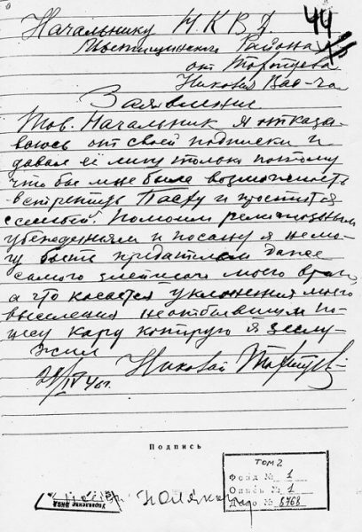 На следующий день диакон Николай вновь был в этом кабинете, но уже с письменным заявлением. Этот документ сохранился, архивы НКВД донесли его до нас. Это целое исповедание веры. «Товарищ начальник, – говорится в тексте, – я отказываюсь от своей подписки и давал ее лишь потому, чтобы мне была возможность встретить Пасху и проститься с семьей. По моим религиозным убеждениям и по сану я не могу быть предателем даже самого злейшего моего врага…»