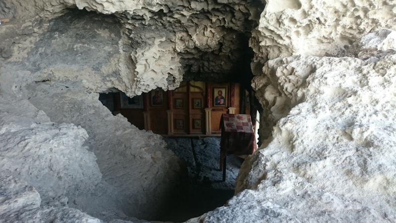 К монастырю ведет узкая и крутая тропа, которая ныряет в расщелину в обрыве. Спуск продолжается по деревянной лестнице, и затем вдоль скальной стены походим к пещерному храму. Мы как раз попали на чтение канона Святой блаженной матушке Матроне Московской. По окончании содержательно побеседовали с насельником монастыря – игуменом Иакинфом.