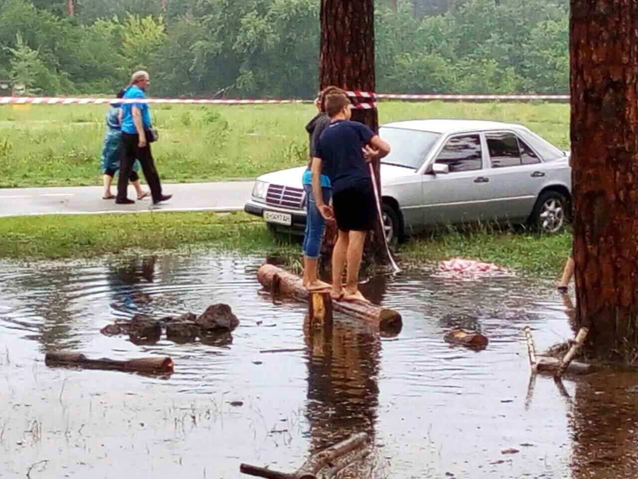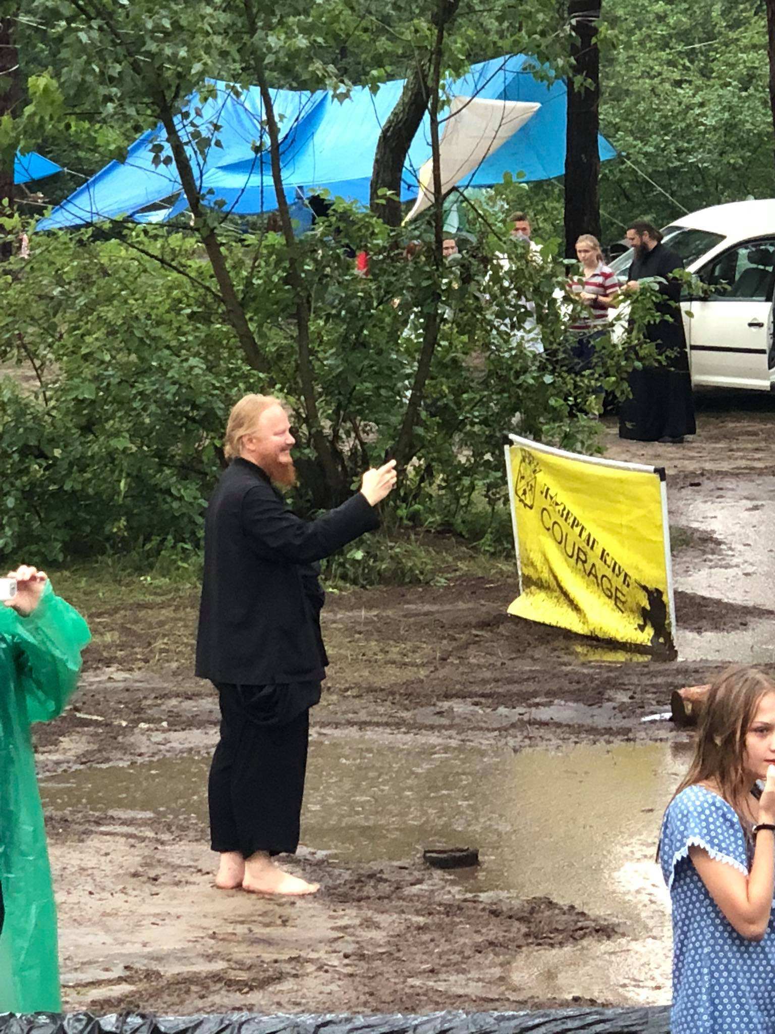 Спустя 5 минут после моего чудо исцеления шеи, закончил лить дождь. В лагере образовались целые «озера» из луж. И участники весело развлекались. Владыка Иона ходил босой и фоткал отчаянных участников, взбиравшихся на «белый трон» посреди «моря» (пластмассовый стул посреди огромнейшей лужи.