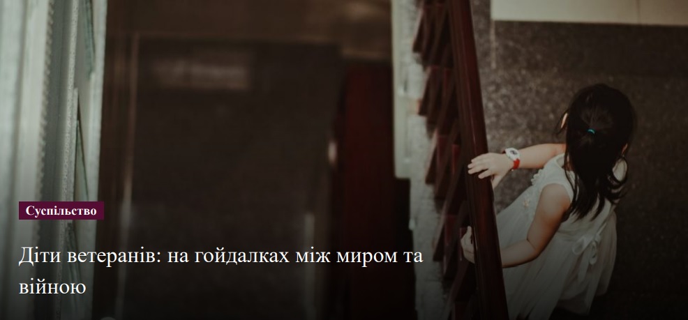 Засоби масової інформації із задоволенням подають інформацію про позитивний досвід адаптації ветеранів у мирному соціумі. Це дуже тішить. До того ж добрий приклад має бути натхненням для інших комбатантів. «Але чимала кількість ветеранських родин відмежовує себе від суспільства, – зауважує голова ГО «Трансформація. Спільнота психологів-волонтерів» психолог-консультант Алла Державіна. – Помітивши в дитини психологічну проблему, мама має негайно вести її до психолога. Але, незважаючи на наші запрошення, дружини ветеранів зі своїми дітками звертаються дуже рідко. Зазвичай вони намагаються вирішити такі проблеми самотужки. За чотири роки в нашу організацію було лише два звернення. Якщо їх запрошують у рамках якогось проекту добровільно-примусово – приходять. Але великої жаги до роботи із власною травмою у них немає. Тож діти зазвичай в питанні душевних травм належать самі собі. У нас немає культури з ними про це говорити».