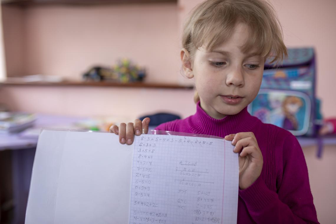 Вибравшись з-під обстрілів, дівчинка повернулася до читання та прописів. Скоро вона почне ходити до нової школи, і сподівається, що там зустріне нових друзів.