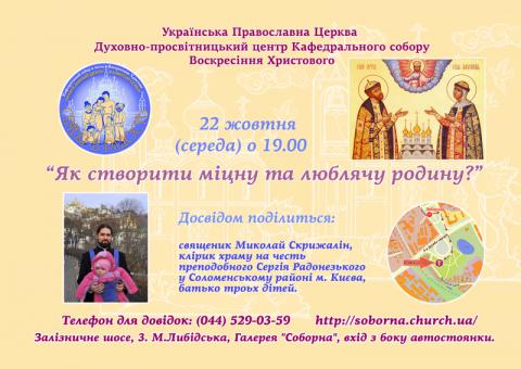 20 октября 201422 жовтня о 19.00 запрошуємо всіх, хто цікавиться питаннями православної сім’ї на традиційну духовну бесіду «Як створити міцну та люблячу сім’ю?». Досвідом сімейного життя поділиться священик Миколай Скрижалін — клірик храму на честь преподобного Сергія Родонезького у Солом’янському районі м. Києва.