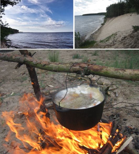 Ищем свободную полянку, приступаем к водным процедурам и, параллельно, готовим обед на костре. Созерцаем бескрайнюю водную гладь, слушаем прибой, любуемся обрывистыми берегами. На все это выделяем 2-2,5 часа.