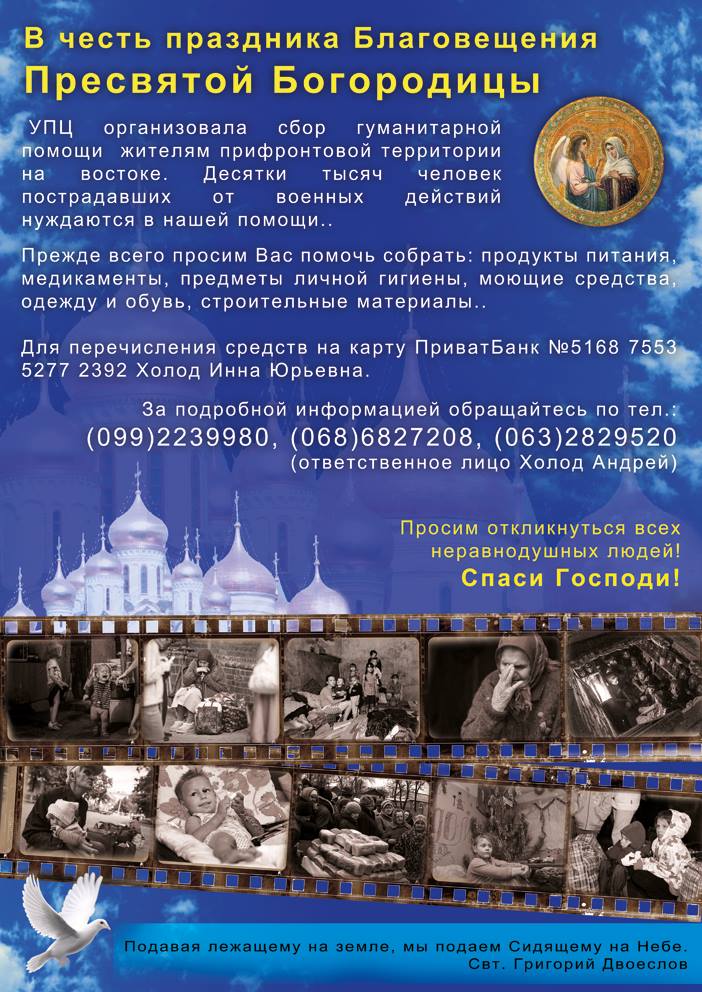 В честь праздника Благовещение Пресвятой Богородицы, УПЦ организовала сбор гуманитарной помощи детям, старикам, инвалидам прифронтовой территории на востоке.