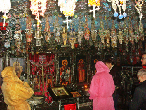 Посещение скита св. Анастасии Узорешительницы Бахчисарайского Свято-Успенского монастыря, расположенного в окрестностях Качи-Кальона — седьмое чудо нашего похода. Ведь его убранство нельзя сравнить ни с одним храмом. Все стены, потолок, предметы и даже иконы украшены узорами, выложенными из камня и бисера. Это удивительно теплое место своим убранством напоминает храмы Ближнего востока.