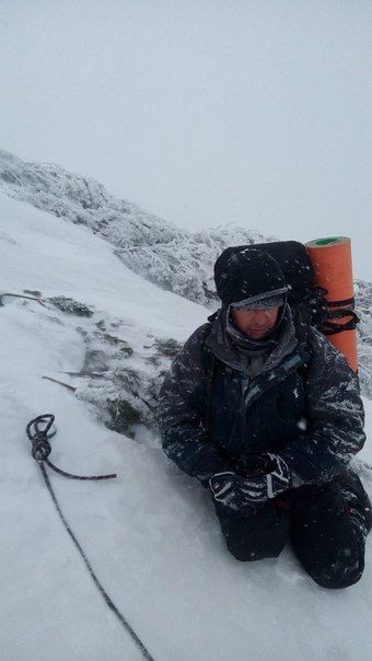Мы как-то быстро, даже не сошли, а скатились метров на 50 вниз. И застыли на поросшем небольшими елочками склоне. Что дальше внизу невозможно было рассмотреть из-за тумана. Неожиданно один из участников проскользил по насту метров пять и ударился об елочку (подвели скользкие арктические бахилы). Сергей достал бухту веревки, расчехлил ледоруб, и одел кошки. Ветер стал чуть тише, иногда порывы рассеивали туман, и где- то там, в низине, можно было разглядеть ущелье. Чтобы понять, как нам спускаться, Сергей прошел вперед и оценил крутизну склона и способы спуска. Спускались по закрепленной веревке спортивным способом.