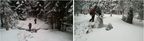 Ущелье, в которое мы спустились, оказалось узким каньоном, зажатым крутыми склонами, и резко уходящим вниз. В начале этого каньона находился исток ручья Гропинець. Предстояло идти или крутыми склонами, поросшими кустами и по пояс в снегу или прямо по круто спадающему ручью.