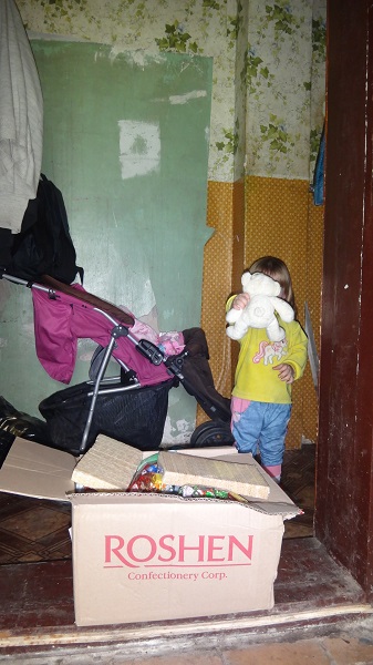 Отец Андрей из авдеевского благочиния попросил нас помочь продуктами жителям старой части Авдеевки (эта часть города расположена вблизи Ясиноватой, граничит с фронтом и постоянно обстреливается). Когда выгружали коробки на ступеньки храма, один из мужчин посоветовал заносить их сразу же в помещение, так как в любой момент может прилететь снаряд. С помощью прихожан мы разгрузили машину и вернулись в новую часть Авдеевки. Там мы доставили гуманитарную помощь матери четырех детей.
